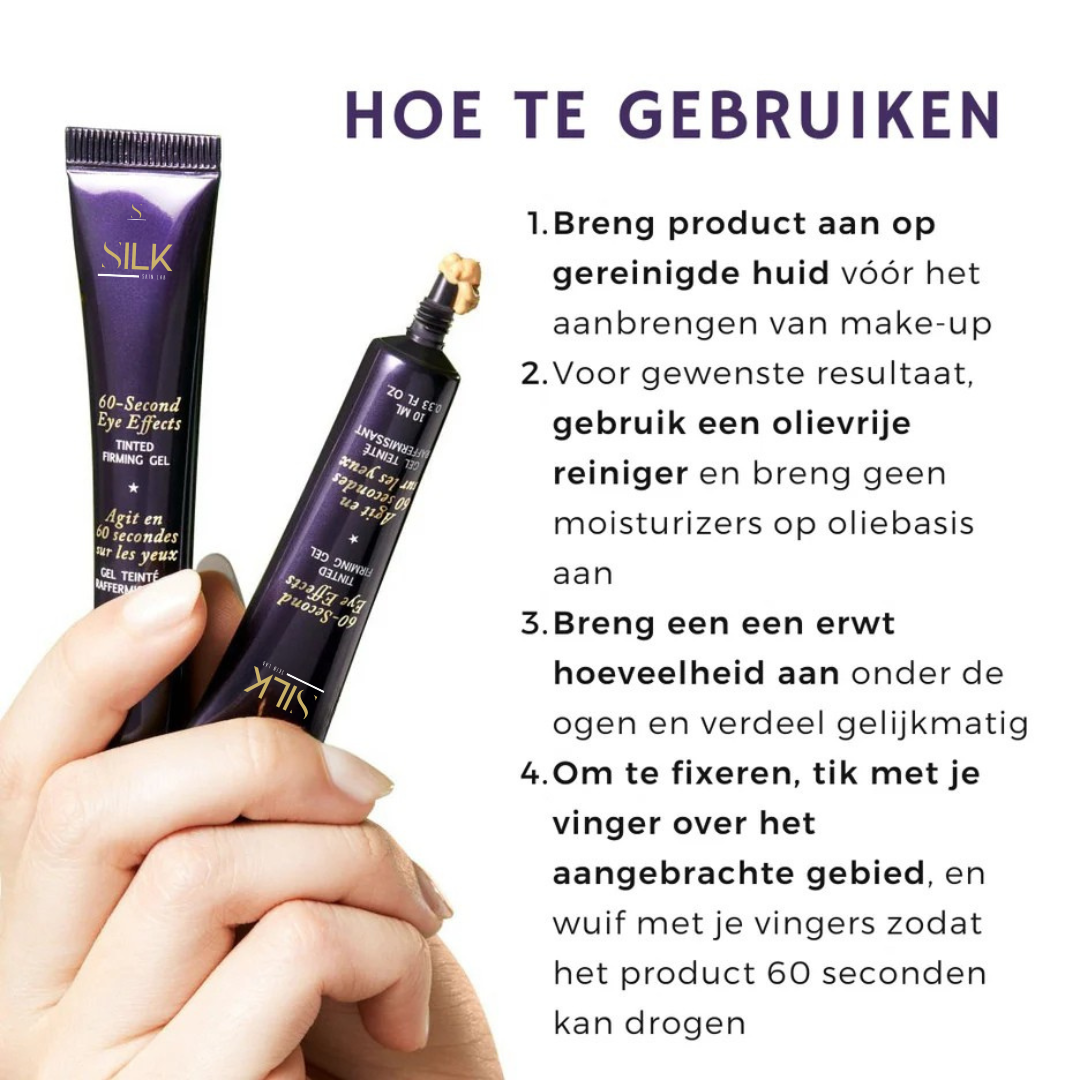 Verdeel de gel gelijkmatig met lichte, strijkende bewegingen. Tik daarna zachtjes met je vingertop op het behandelde gebied om het product te fixeren. Voor een zichtbaar verstevigend effect: houd je gezichtsspieren volledig ontspannen en laat het product 60 seconden drogen.
