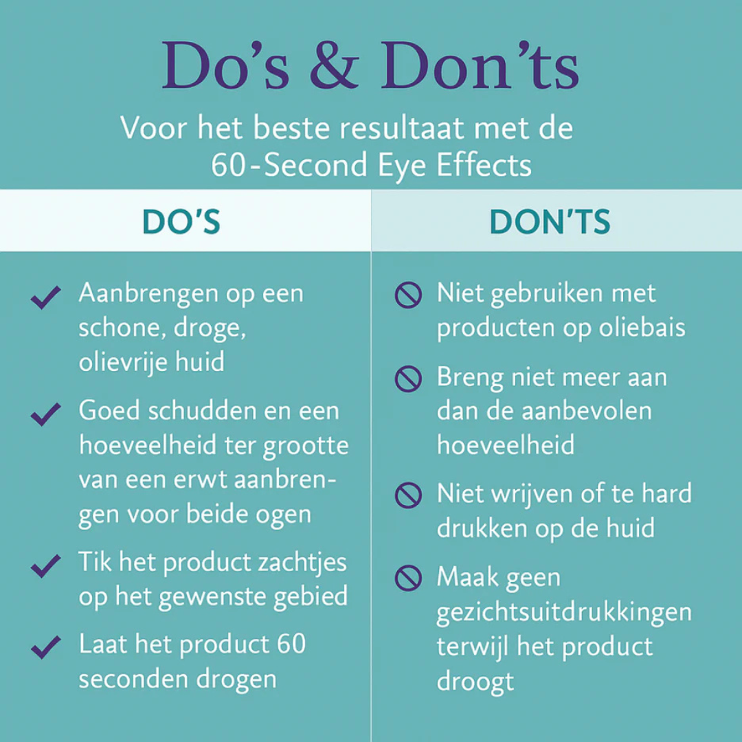 Breng het serum aan op een schone, met een olievrije reiniger gereinigde huid. Gebruik géén moisturizer vooraf. Doseer een kleine hoeveelheid – ter grootte van een erwt – op je vingertop. Breng de gel voorzichtig aan onder de ogen, beginnend bij de binnenste ooghoek en strijk richting de buitenkant, over fijne lijntjes, rimpels en wallen.